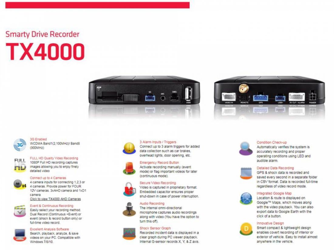 The Smarty TX4000 is a new generation dash camera that offers 3G telecommunication capabilities allowing for immediate data transfer in case of an accident. A must for insurance companies and vehicle management providers. With a built-in microphone, GPS, and G-sensor as well, the TX4000 can also process, present, and communicate this information, helping to analyze accidents, coach drivers, and ultimately reduce costs. TX4000, an in-vehicle drive recorder, offers commercial vehicle owners an effective risk-reducing means to aid in the investigation process, decrease collateral damages associated with car accidents, encourage safe driving, monitor driving behaviors and enhance the overall safety on the road.