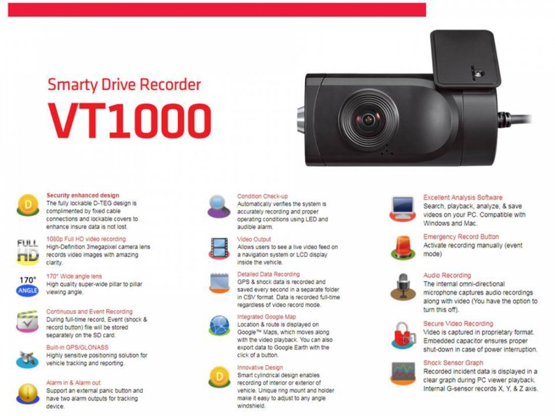 新款 Smarty VT1000 具有一些關鍵的新功能和優化功能,使其成為當今道路上最好的獨立式行車記錄儀。全高清 3 百萬像素彩色 CMOS 感應器以清晰的影像記錄細節記錄視頻圖像。內部全方位麥克風音頻與錄像視頻一起記錄(可在軟件設置中關閉)。具有內置的超廣角鏡頭。最後,新版本的電腦軟件,令用戶擁有得更好的使用體驗。